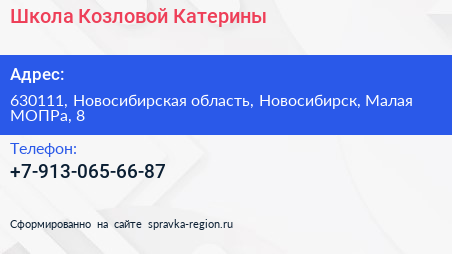 Школа Козловой Катерины по адресу 630111, Новосибирская область, Новосибирск, Малая МОПРа, 8 в дальнейшем Организация, размещена в следующих категориях: