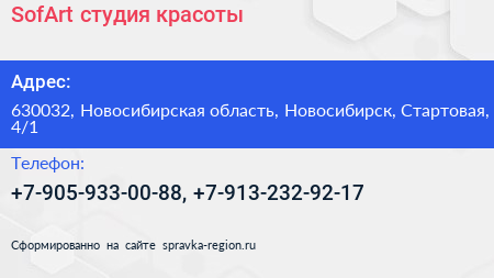 SofArt, студия красоты по адресу 630032, Новосибирская область, Новосибирск, Стартовая, 4/1 в дальнейшем Организация, размещена в следующих категориях: