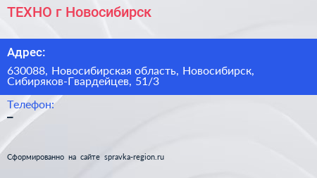 ТЕХНО, г. Новосибирск по адресу 630088, Новосибирская область, Новосибирск, Сибиряков-Гвардейцев, 51/3 в дальнейшем Организация, размещена в следующих категориях: