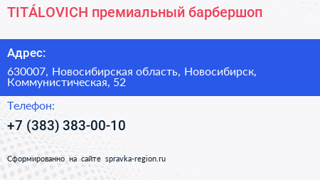 TITÁLOVICH, премиальный барбершоп по адресу 630007, Новосибирская область, Новосибирск, Коммунистическая, 52 в дальнейшем Организация, размещена в следующих категориях: