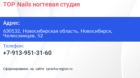 TOP Nails, ногтевая студия по адресу 630132, Новосибирская область, Новосибирск, Челюскинцев, 52 в дальнейшем Организация, размещена в следующих категориях: