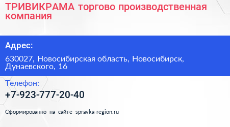 ТРИВИКРАМА, торгово-производственная компания по адресу 630027, Новосибирская область, Новосибирск, Дунаевского, 16 в дальнейшем Организация, размещена в следующих категориях: