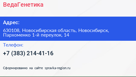 ВедаГенетика по адресу 630108, Новосибирская область, Новосибирск, Пархоменко 1-й переулок, 14 в дальнейшем Организация, размещена в следующих категориях: