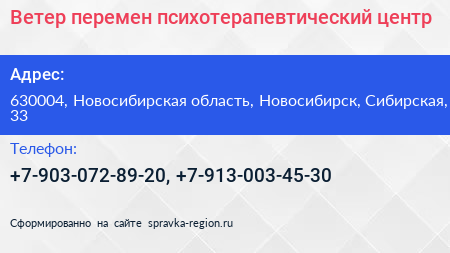 Ветер перемен, психотерапевтический центр по адресу 630004, Новосибирская область, Новосибирск, Сибирская, 33 в дальнейшем Организация, размещена в следующих категориях: