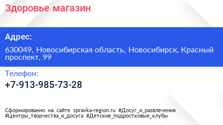 Здоровье, магазин по адресу 630049, Новосибирская область, Новосибирск, Красный проспект, 99 в дальнейшем Организация, размещена в следующих категориях: