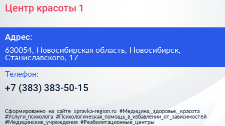 Центр красоты №1 по адресу 630054, Новосибирская область, Новосибирск, Станиславского, 17 в дальнейшем Организация, размещена в следующих категориях: