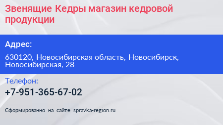 Звенящие Кедры, магазин кедровой продукции по адресу 630120, Новосибирская область, Новосибирск, Новосибирская, 28 в дальнейшем Организация, размещена в следующих категориях: