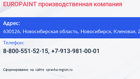 EUROPAINT, производственная компания по адресу 630126, Новосибирская область, Новосибирск, Кленовая, 2 в дальнейшем Организация, размещена в следующих категориях: