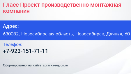Гласс Проект, производственно-монтажная компания по адресу 630082, Новосибирская область, Новосибирск, Дачная, 60 в дальнейшем Организация, размещена в следующих категориях: