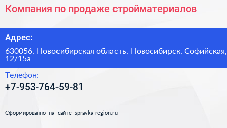 Компания по продаже стройматериалов по адресу 630056, Новосибирская область, Новосибирск, Софийская, 12/15а в дальнейшем Организация, размещена в следующих категориях: