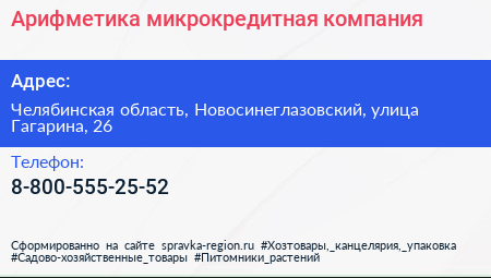 Арифметика, микрокредитная компания по адресу Челябинская область, Новосинеглазовский, улица Гагарина, 26 в дальнейшем Организация, размещена в следующих категориях: