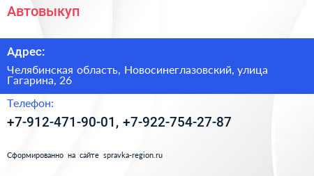 Автовыкуп по адресу Челябинская область, Новосинеглазовский, улица Гагарина, 26 в дальнейшем Организация, размещена в следующих категориях: