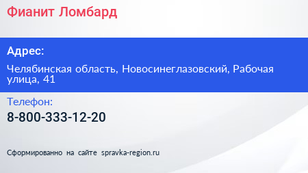 Фианит-Ломбард по адресу Челябинская область, Новосинеглазовский, Рабочая улица, 41 в дальнейшем Организация, размещена в следующих категориях: