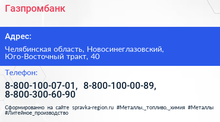 Газпромбанк по адресу Челябинская область, Новосинеглазовский, Юго-Восточный тракт, 40 в дальнейшем Организация, размещена в следующих категориях:
