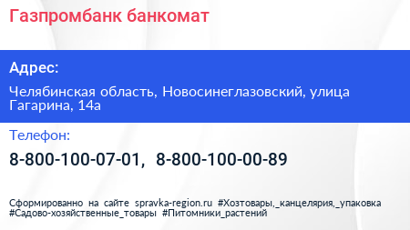 Газпромбанк, банкомат по адресу Челябинская область, Новосинеглазовский, улица Гагарина, 14а в дальнейшем Организация, размещена в следующих категориях: