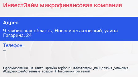 ИнвестЗайм, микрофинансовая компания по адресу Челябинская область, Новосинеглазовский, улица Гагарина, 24 в дальнейшем Организация, размещена в следующих категориях: