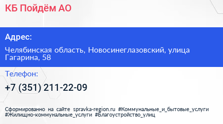 КБ Пойдём, АО по адресу Челябинская область, Новосинеглазовский, улица Гагарина, 58 в дальнейшем Организация, размещена в следующих категориях: