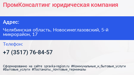ПромКонсалтинг, юридическая компания по адресу Челябинская область, Новосинеглазовский, 5-й микрорайон, 17 в дальнейшем Организация, размещена в следующих категориях: