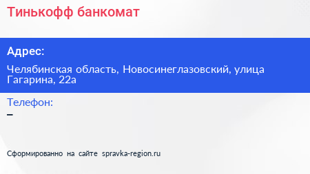 Тинькофф, банкомат по адресу Челябинская область, Новосинеглазовский, улица Гагарина, 22а в дальнейшем Организация, размещена в следующих категориях: