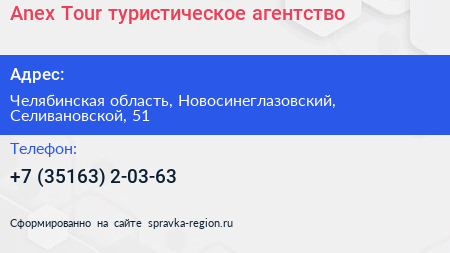 Anex Tour, туристическое агентство по адресу Челябинская область, Новосинеглазовский, Селивановской, 51 в дальнейшем Организация, размещена в следующих категориях: