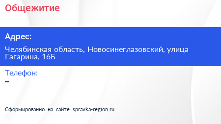 Общежитие по адресу Челябинская область, Новосинеглазовский, улица Гагарина, 16Б в дальнейшем Организация, размещена в следующих категориях: