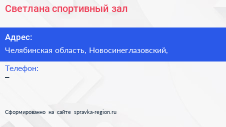 Светлана, спортивный зал по адресу Челябинская область, Новосинеглазовский, в дальнейшем Организация, размещена в следующих категориях: