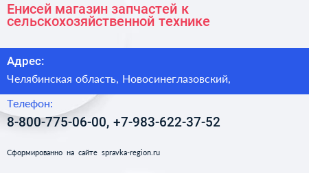 Енисей, магазин запчастей к сельскохозяйственной технике по адресу Челябинская область, Новосинеглазовский, в дальнейшем Организация, размещена в следующих категориях: