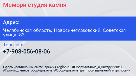 Мемори, студия камня по адресу Челябинская область, Новосинеглазовский, Советская улица, 83 в дальнейшем Организация, размещена в следующих категориях: