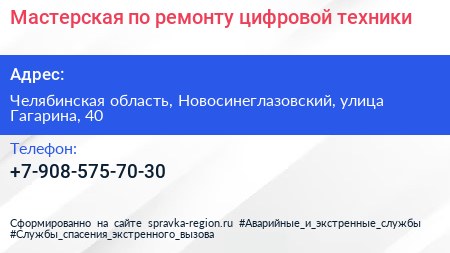 Мастерская по ремонту цифровой техники по адресу Челябинская область, Новосинеглазовский, улица Гагарина, 40 в дальнейшем Организация, размещена в следующих категориях: