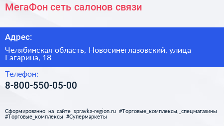 МегаФон, сеть салонов связи по адресу Челябинская область, Новосинеглазовский, улица Гагарина, 18 в дальнейшем Организация, размещена в следующих категориях: