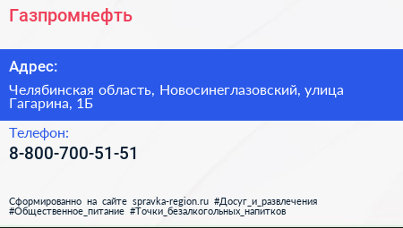 Газпромнефть по адресу Челябинская область, Новосинеглазовский, улица Гагарина, 1Б в дальнейшем Организация, размещена в следующих категориях: