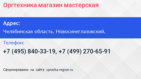 Оргтехника, магазин-мастерская по адресу Челябинская область, Новосинеглазовский, в дальнейшем Организация, размещена в следующих категориях:
