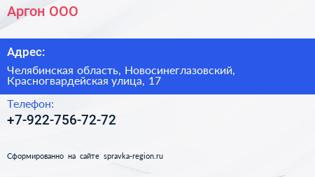 Аргон, ООО по адресу Челябинская область, Новосинеглазовский, Красногвардейская улица, 17 в дальнейшем Организация, размещена в следующих категориях: