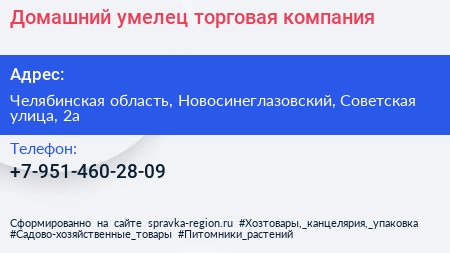 Домашний умелец, торговая компания по адресу Челябинская область, Новосинеглазовский, Советская улица, 2а в дальнейшем Организация, размещена в следующих категориях: