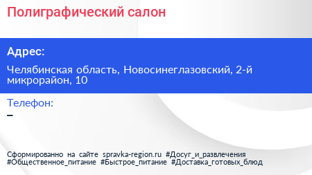 Полиграфический, салон по адресу Челябинская область, Новосинеглазовский, 2-й микрорайон, 10 в дальнейшем Организация, размещена в следующих категориях: