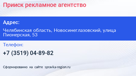 Прииск, рекламное агентство по адресу Челябинская область, Новосинеглазовский, улица Пионерская, 53 в дальнейшем Организация, размещена в следующих категориях: