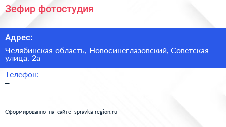 Зефир, фотостудия по адресу Челябинская область, Новосинеглазовский, Советская улица, 2а в дальнейшем Организация, размещена в следующих категориях: