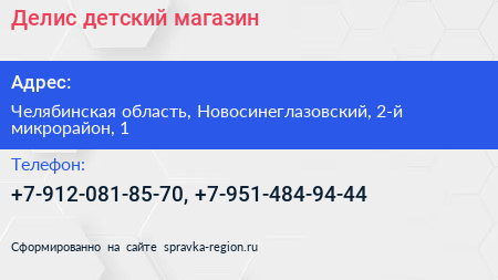 Делис, детский магазин по адресу Челябинская область, Новосинеглазовский, 2-й микрорайон, 1 в дальнейшем Организация, размещена в следующих категориях:
