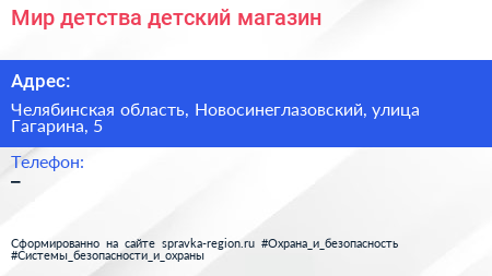 Мир детства, детский магазин по адресу Челябинская область, Новосинеглазовский, улица Гагарина, 5 в дальнейшем Организация, размещена в следующих категориях: