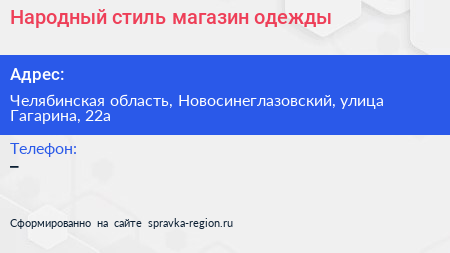 Народный стиль, магазин одежды по адресу Челябинская область, Новосинеглазовский, улица Гагарина, 22а в дальнейшем Организация, размещена в следующих категориях: