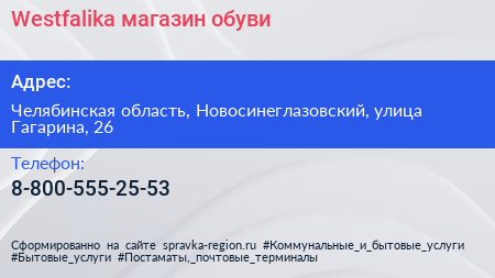 Westfalika, магазин обуви по адресу Челябинская область, Новосинеглазовский, улица Гагарина, 26 в дальнейшем Организация, размещена в следующих категориях: