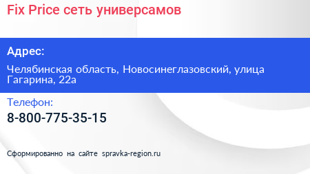Fix Price, сеть универсамов по адресу Челябинская область, Новосинеглазовский, улица Гагарина, 22а в дальнейшем Организация, размещена в следующих категориях: