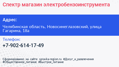 Спектр, магазин электробензоинструмента по адресу Челябинская область, Новосинеглазовский, улица Гагарина, 18а в дальнейшем Организация, размещена в следующих категориях:
