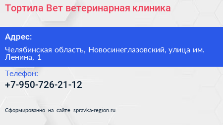 Тортила-Вет, ветеринарная клиника по адресу Челябинская область, Новосинеглазовский, улица им. Ленина, 1 в дальнейшем Организация, размещена в следующих категориях: