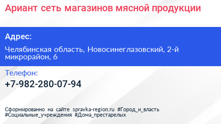 Ариант, сеть магазинов мясной продукции по адресу Челябинская область, Новосинеглазовский, 2-й микрорайон, 6 в дальнейшем Организация, размещена в следующих категориях:
