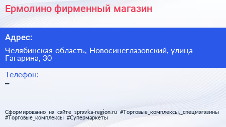 Ермолино, фирменный магазин по адресу Челябинская область, Новосинеглазовский, улица Гагарина, 30 в дальнейшем Организация, размещена в следующих категориях:
