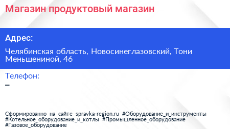 Магазин, продуктовый магазин по адресу Челябинская область, Новосинеглазовский, Тони Меньшениной, 46 в дальнейшем Организация, размещена в следующих категориях: