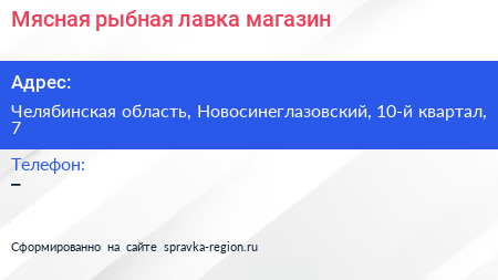 Мясная рыбная лавка, магазин по адресу Челябинская область, Новосинеглазовский, 10-й квартал, 7 в дальнейшем Организация, размещена в следующих категориях: