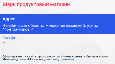 Мэри, продуктовый магазин по адресу Челябинская область, Новосинеглазовский, улица Монтажников, 4 в дальнейшем Организация, размещена в следующих категориях:
