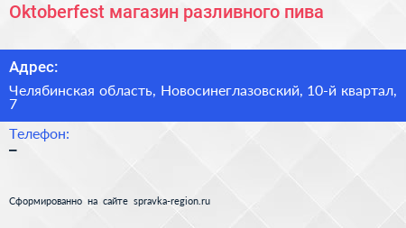 Oktoberfest, магазин разливного пива по адресу Челябинская область, Новосинеглазовский, 10-й квартал, 7 в дальнейшем Организация, размещена в следующих категориях: